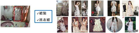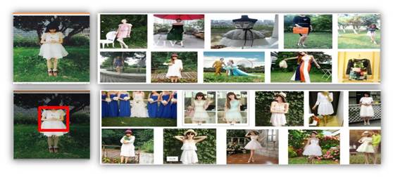第一幅图没有由于进行抠图,搜索结果中背景干扰比较明显,都出现了绿色的背景,而用户真正关心的主体衣服的搜索质量则很差。第二幅图进行抠图之后,搜索结果有了非常显著的提高,主体衣服的匹配程度非常高。