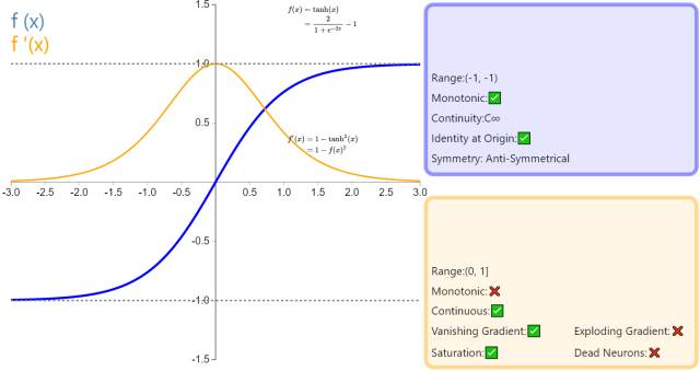 在分类任务中,双曲正切函数(Tanh)逐渐取代 Sigmoid 函数作为标准的激活函数,其具有很多神经网络所钟爱的特征。它是完全可微分的,反对称,对称中心在原点。为了解决学习缓慢和/或梯度消失问题,可以使用这个函数的更加平缓的变体(log-log、softsign、symmetrical sigmoid 等等)