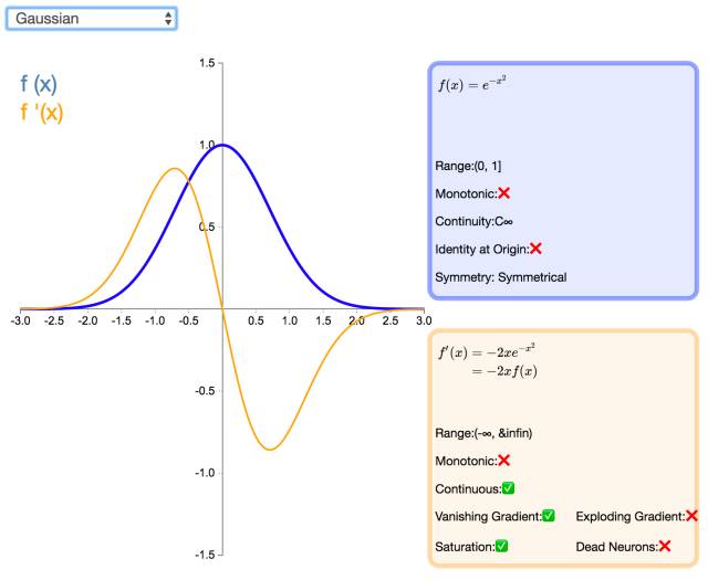 高斯激活函数(Gaussian)并不是径向基函数网络(RBFN)中常用的高斯核函数,高斯激活函数在多层感知机类的模型中并不是很流行。该函数处处可微且为偶函数,但一阶导会很快收敛到零。