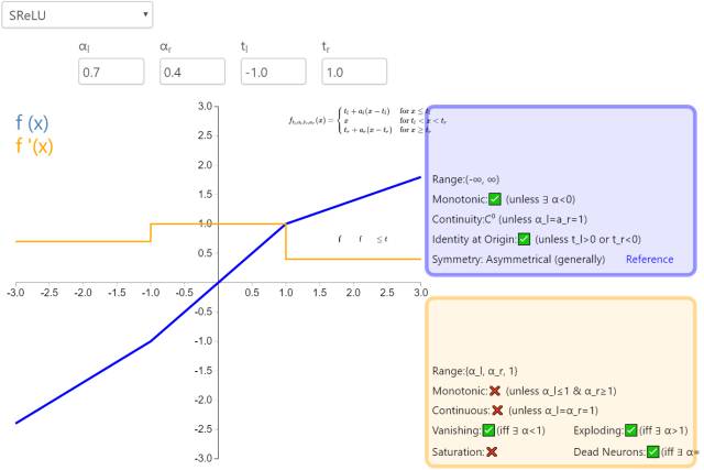 S 型整流线性激活单元(S-shaped Rectified Linear Activation Unit,SReLU)属于以 ReLU 为代表的整流激活函数族。它由三个分段线性函数组成。其中两种函数的斜度,以及函数相交的位置会在模型训练中被学习。
