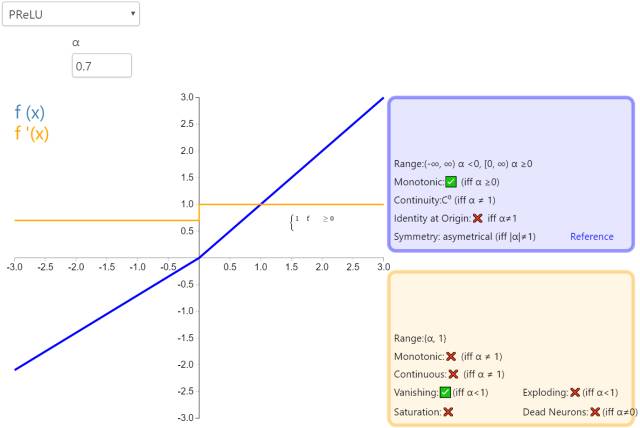 参数化修正线性单元(Parameteric Rectified Linear Unit,PReLU)属于 ReLU 修正类激活函数的一员。它和 RReLU 以及 Leaky ReLU 有一些共同点,即为负值输入添加了一个线性项。而最关键的区别是,这个线性项的斜率实际上是在模型训练中学习到的。