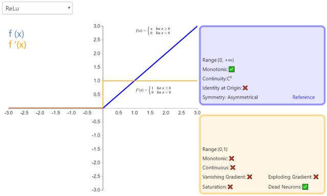 修正线性单元(Rectified linear unit,ReLU)是神经网络中最常用的激活函数。它保留了 step 函数的生物学启发(只有输入超出阈值时神经元才激活),不过当输入为正的时候,导数不为零,从而允许基于梯度的学习(尽管在 x=0 的时候,导数是未定义的)。使用这个函数能使计算变得很快,因为无论是函数还是其导数都不包含复杂的数学运算。然而,当输入为负值的时候,ReLU 的学习速度可能会变得很慢,甚至使神经元直接无效,因为此时输入小于零而梯度为零,从而其权重无法得到更新,在剩下的训练过程中会一直保持静默。