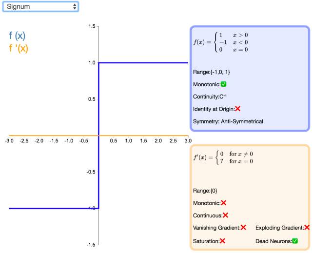 激活函数 Signum(或者简写为 Sign)是二值阶跃激活函数的扩展版本。它的值域为 [-1,1],原点值是 0。尽管缺少阶跃函数的生物动机,Signum 依然是反对称的,这对激活函数来说是一个有利的特征。