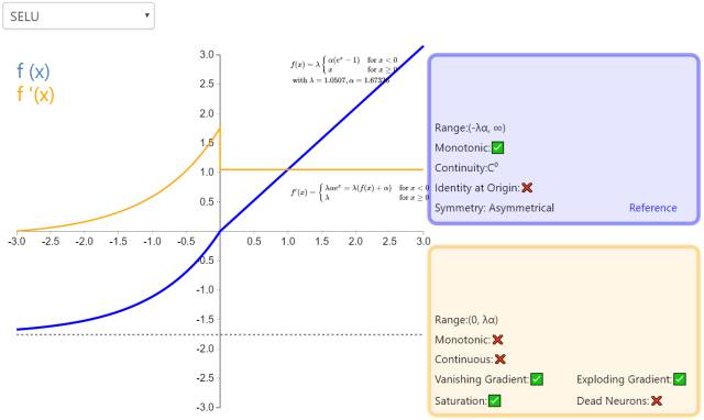 扩展指数线性单元(Scaled Exponential Linear Unit,SELU)是激活函数指数线性单元(ELU)的一个变种。其中λ和α是固定数值(分别为 1.0507 和 1.6726)。这些值背后的推论(零均值/单位方差)构成了自归一化神经网络的基础(SNN)。