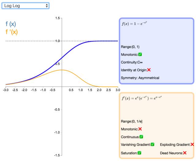 Log Log 激活函数(由上图 f(x) 可知该函数为以 e 为底的嵌套指数函数)的值域为 [0,1],Complementary Log Log 激活函数有潜力替代经典的 Sigmoid 激活函数。该函数饱和地更快,且零点值要高于 0.5。