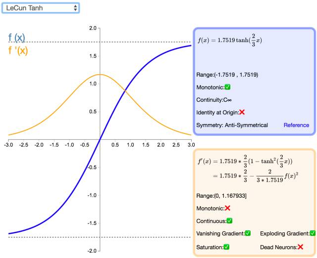 LeCun Tanh(也被称作 Scaled Tanh)是 Tanh 激活函数的扩展版本。它具有以下几个可以改善学习的属性:f(± 1) = ±1;二阶导数在 x=1 最大化;且有效增益接近 1。
