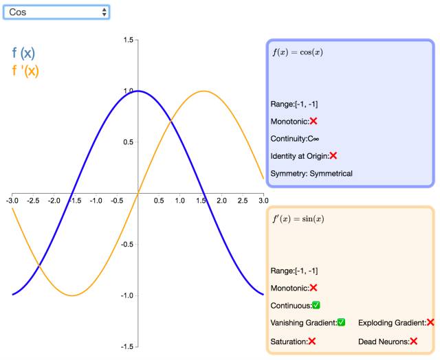 如同正弦函数,余弦激活函数(Cos/Cosine)为神经网络引入了周期性。它的值域为 [-1,1],且导数处处连续。和 Sinusoid 函数不同,余弦函数为不以零点对称的偶函数。
