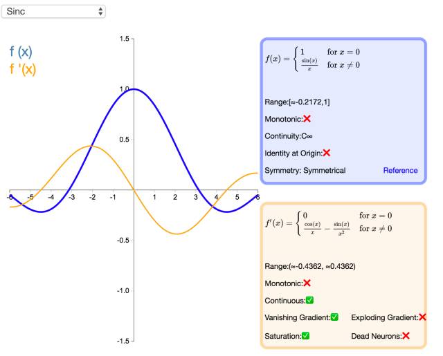 Sinc 函数(全称是 Cardinal Sine)在信号处理中尤为重要,因为它表征了矩形函数的傅立叶变换(Fourier transform)。作为一种激活函数,它的优势在于处处可微和对称的特性,不过它比较容易产生梯度消失的问题。