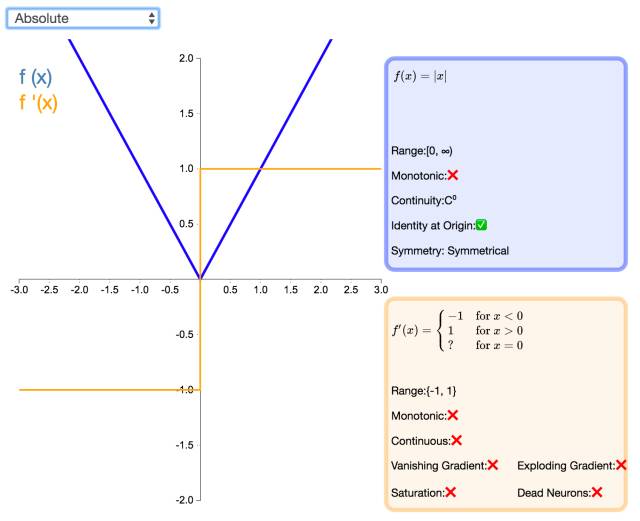 顾名思义,绝对值(Absolute)激活函数返回输入的绝对值。该函数的导数除了零点外处处有定义,且导数的量值处处为 1。这种激活函数一定不会出现梯度爆炸或消失的情况。