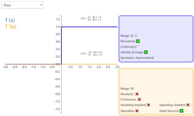 激活函数 Step 更倾向于理论而不是实际,它模仿了生物神经元要么全有要么全无的属性。它无法应用于神经网络,因为其导数是 0(除了零点导数无定义以外),这意味着基于梯度的优化方法并不可行。