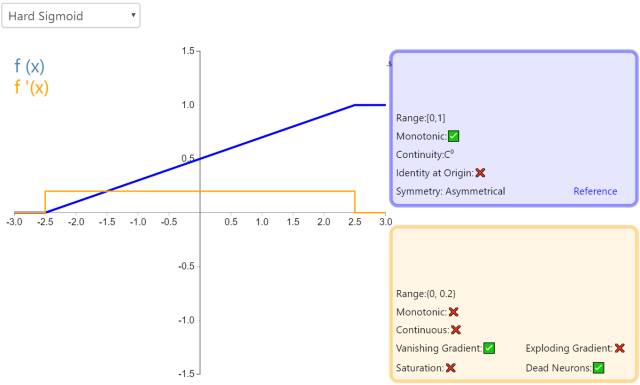 Hard Sigmoid 是 Logistic Sigmoid 激活函数的分段线性近似。它更易计算,这使得学习计算的速度更快,尽管首次派生值为零可能导致静默神经元/过慢的学习速率(详见 ReLU)。