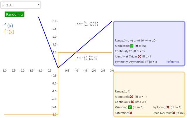 随机带泄露的修正线性单元(Randomized Leaky Rectified Linear Unit,RReLU)也属于 ReLU 修正类激活函数的一员。和 Leaky ReLU 以及 PReLU 很相似,为负值输入添加了一个线性项。而最关键的区别是,这个线性项的斜率在每一个节点上都是随机分配的(通常服从均匀分布)。