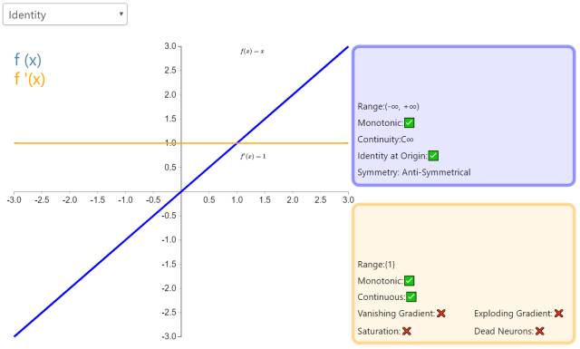 通过激活函数 Identity,节点的输入等于输出。它完美适合于潜在行为是线性(与线性回归相似)的任务。当存在非线性,单独使用该激活函数是不够的,但它依然可以在最终输出节点上作为激活函数用于回归任务。
