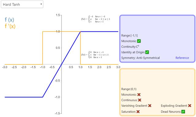 Hard Tanh 是 Tanh 激活函数的线性分段近似。相较而言,它更易计算,这使得学习计算的速度更快,尽管首次派生值为零可能导致静默神经元/过慢的学习速率(详见 ReLU)。