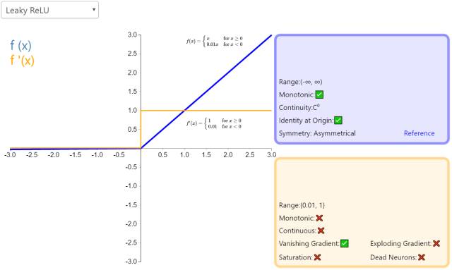 经典(以及广泛使用的)ReLU 激活函数的变体,带泄露修正线性单元(Leaky ReLU)的输出对负值输入有很小的坡度。由于导数总是不为零,这能减少静默神经元的出现,允许基于梯度的学习(虽然会很慢)。