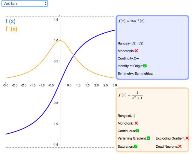 视觉上类似于双曲正切(Tanh)函数,ArcTan 激活函数更加平坦,这让它比其他双曲线更加清晰。在默认情况下,其输出范围在-π/2 和π/2 之间。其导数趋向于零的速度也更慢,这意味着学习的效率更高。但这也意味着,导数的计算比 Tanh 更加昂贵。