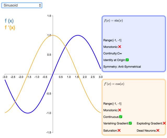 如同余弦函数,Sinusoid(或简单正弦函数)激活函数为神经网络引入了周期性。该函数的值域为 [-1,1],且导数处处连续。此外,Sinusoid 激活函数为零点对称的奇函数。