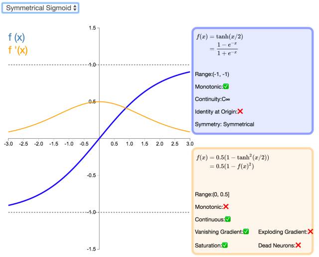 Symmetrical Sigmoid 是另一个 Tanh 激活函数的变种(实际上,它相当于输入减半的 Tanh)。和 Tanh 一样,它是反对称的、零中心、可微分的,值域在 -1 到 1 之间。它更平坦的形状和更慢的下降派生表明它可以更有效地进行学习。