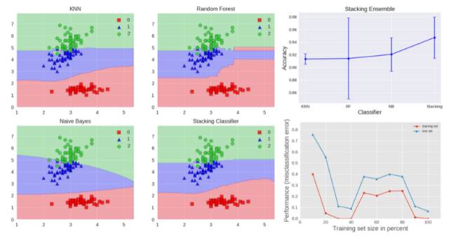 stacking 集成如上图所示。它由 k-NN、随机森林和朴素贝叶斯基础分类器组成,它的预测结果由作为元分类器的 Logistic 回归组合。我们可以看到 stacking 分类器实现的混合决策边界。该图还显示,stacking 能够实现比单个分类器更高的准确率,并且从学习曲线看出,其没有显示过拟合的迹象。