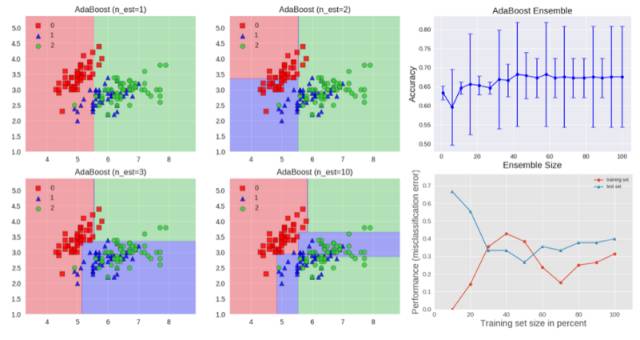 AdaBoost 算法如上图所示。每个基础学习器由深度为 1 的决策树组成,从而基于特征阈值对数据进行分类,该特征阈值将空间分割成由与一个轴平行的线性决策表面分开的两个区域。该图还显示了测试集的准确率随集合大小的增加而改善,同时显示了训练数据和测试数据的学习曲线。