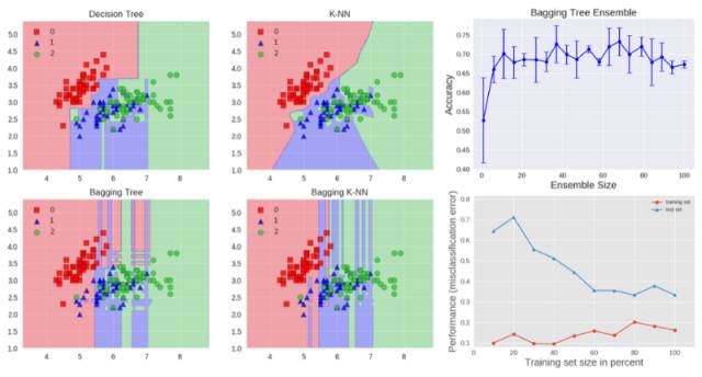 我们可以在 Iris 数据集上研究 bagging 方法的分类效果。为了对比预测效果,我们选用两个基准估计器:决策树和 k-NN 分类器。图 1 显示了基准估计器和 bagging 集成算法在 Iris 数据集上的学习决策边界。