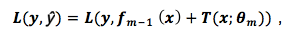 基函数确定我们的损失函数也可以确定,函数T表示决策树,m表示决策树个数或者弱分类器个数,theta表示决策树的区域划分(可以理解为:决策树的划分路径)和各区域的常数。我们最终的预测结果是f(m-1)+T(m),这里f(m-1)是前m-1次预测的累加结果,而最终的误差项为