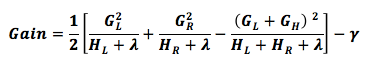 上式中:γ(gamma)即阈值,是叶子节点数T的系数 ,类似XGBoost做了前剪枝,系数λ(lambda),是正则项里LeafScore的L2模平方的系数,对LeafScore做了平滑,也起到了防止过拟合的作用。