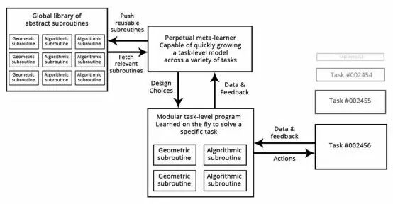 想想今天的软件开发过程:一旦工程师解决了一个特定的问题(例如Python中的HTTP查询),他们将把它打包成一个抽象的和可重用的库。未来面临类似问题的工程师可以简单地搜索现有的库,下载并在自己的项目中使用它们。以类似的方式,将来,元学习系统将能够通过筛选高级可重用块的全局库来组装新程序。当系统发现自己为几个不同的任务开发类似的程序子程序时,如果会出现一个“抽象的”可重用的子程序版本,并将它存储在全局库中。这样的过程将实现抽象的能力,这是实现“极端泛化”的必要组件:被发现在不同任务和域中有用的子程序可以说是“抽象化”问题解决的一些方面。“抽象”的定义与软件工程中抽象的概念相似。这些子程序可以是几何的(具有预先训练的表示的深度学习模块)或算法(更靠近当代软件工程师操作的库)。