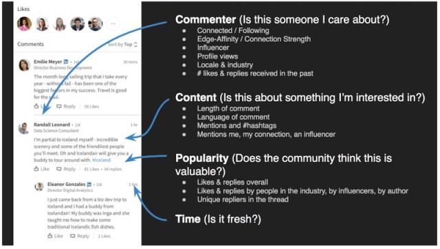 而在实际评论内容层面,领英的技术专家利用自己的内部自然语言处理(简称 NLP)库来表达语言、评论长度、语法结构、主题标签的存在 / 不存在以及其它内容特征。他们还尝试推断评论当中是否有提及其他领英会员或者其它职能实体。