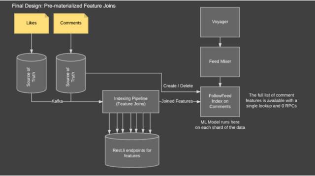 这套系统尚处于早期开发阶段,因此还无法顺畅处理各类特征。在各个交付节点之上设置并使用特征存储库,在各节点间合理发布数据,并根据特定键进行划分。这一流程在基础设施工程层面非常简单:在出现数据时,技术专家们会利用 FollowFeed 出色的模型执行能力对来自机器学习模型内的相关评论进行排名。
