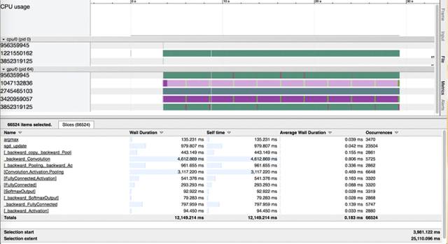 MXNet 有一个内置分析工具,你可通过用 USE_PROFILER=1 标志创建 MXNet 来使用它。这可以帮助你在网络中(符号级)一层一层地对执行时间进行概述。这一特征是在操作层级进行归纳的,而不是在函数级,核级(kernel)或指令级进行操作,从而对一般的分析工具(像 nvprof 和 gprof)进行了补足。你可以使用一个环境变量以在整体 Python 程序中对它进行驱动。或者,你可以通过将它整合进下列代码,以在程序的一个子集中对它进行使用。
