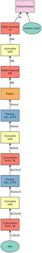 为了使你能够对神经网络架构进行可视化,MXNet 可与 Graphviz(http://www.graphviz.org/)进行集成。为了生成网络可视化结果,你可以使用 symbol (查询被定义网络的最后一层),和被它的 node_atters 属性所定义的网络的形状。下面的实例展示了怎样对 LeNet (http://yann.lecun.com/exdb/lenet/)标准 CNN进行可视化:
